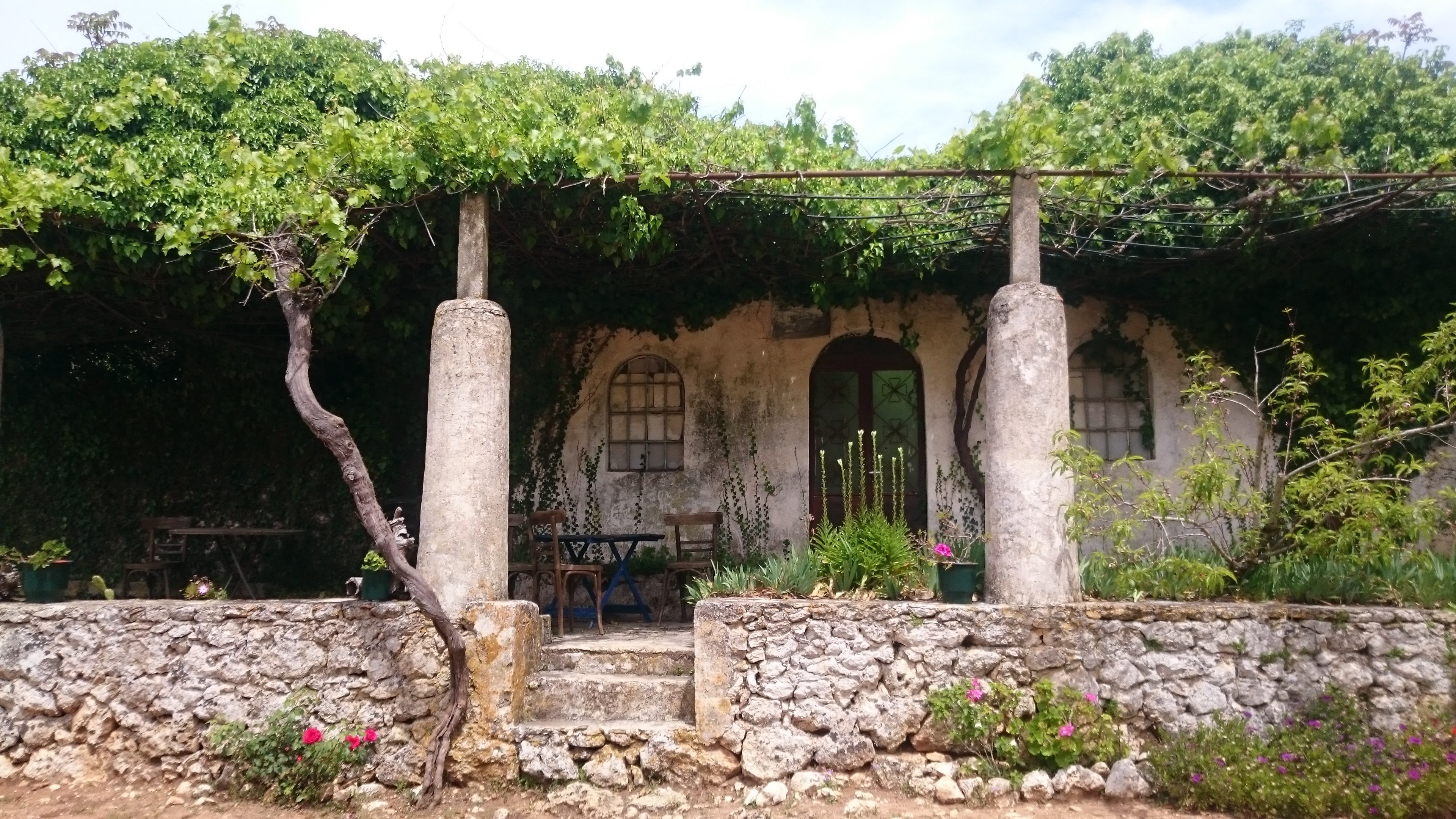 We followed some handmade signs nailed to back-alley fences and hung on olive trees until we came across an archway (to heaven?) with the same writing that stated “black wine”.