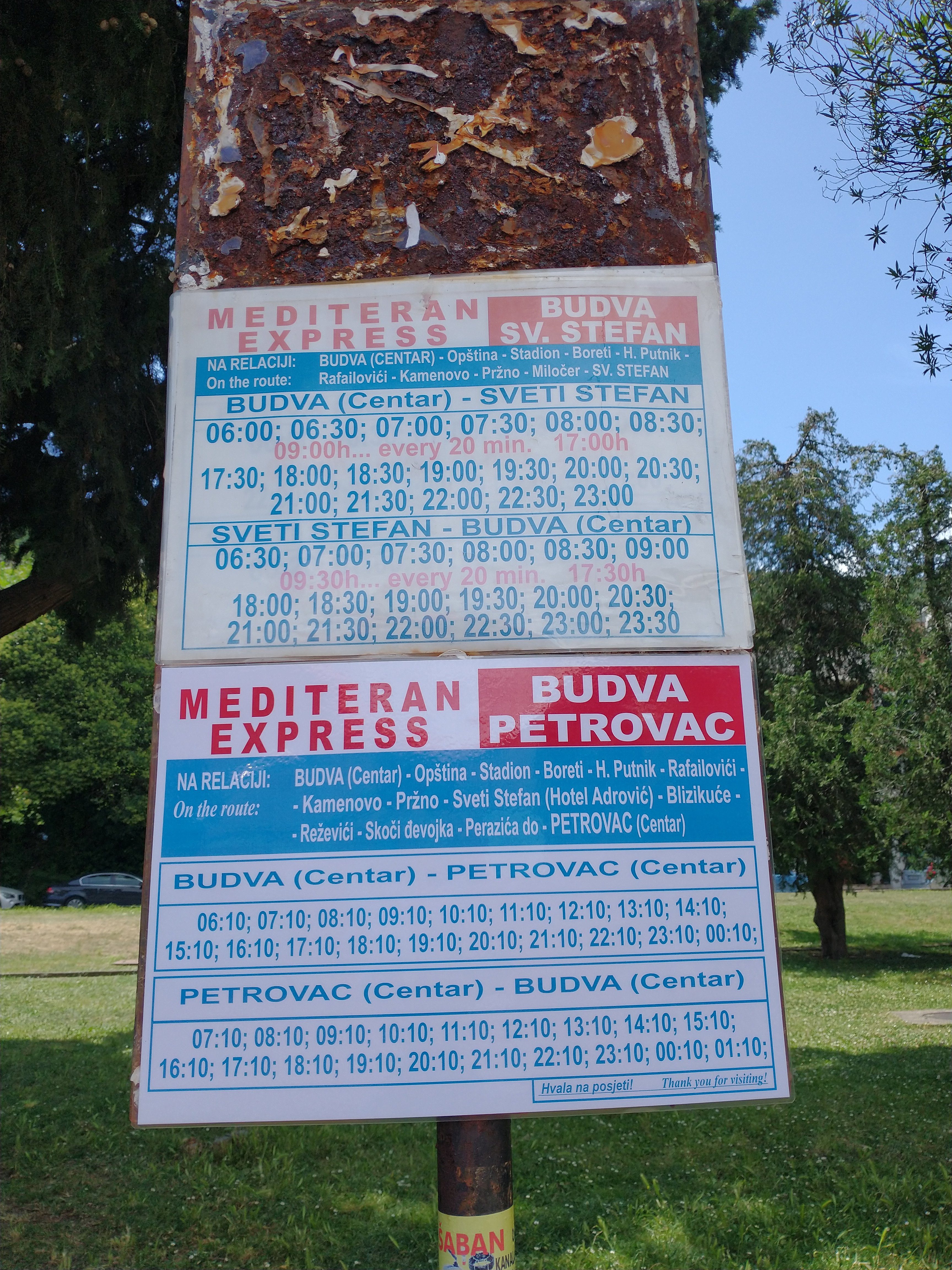 I headed to Sveti Stefan for a “day trip”- which ended up taking less than two hours (I left at 15:25 and was back by 17:05). The bus leaves every 20 minutes and takes 20 minutes or so to get there- randos got picked up off the side of the road so on the way back it took 25 minutes. The bus departs from: Bus stop to Sveti Stefan / Petrovac (2 Mediteranska, Budva, Montenegro), but there are other stops along the way. Best to ask your accommodation what the situation is.