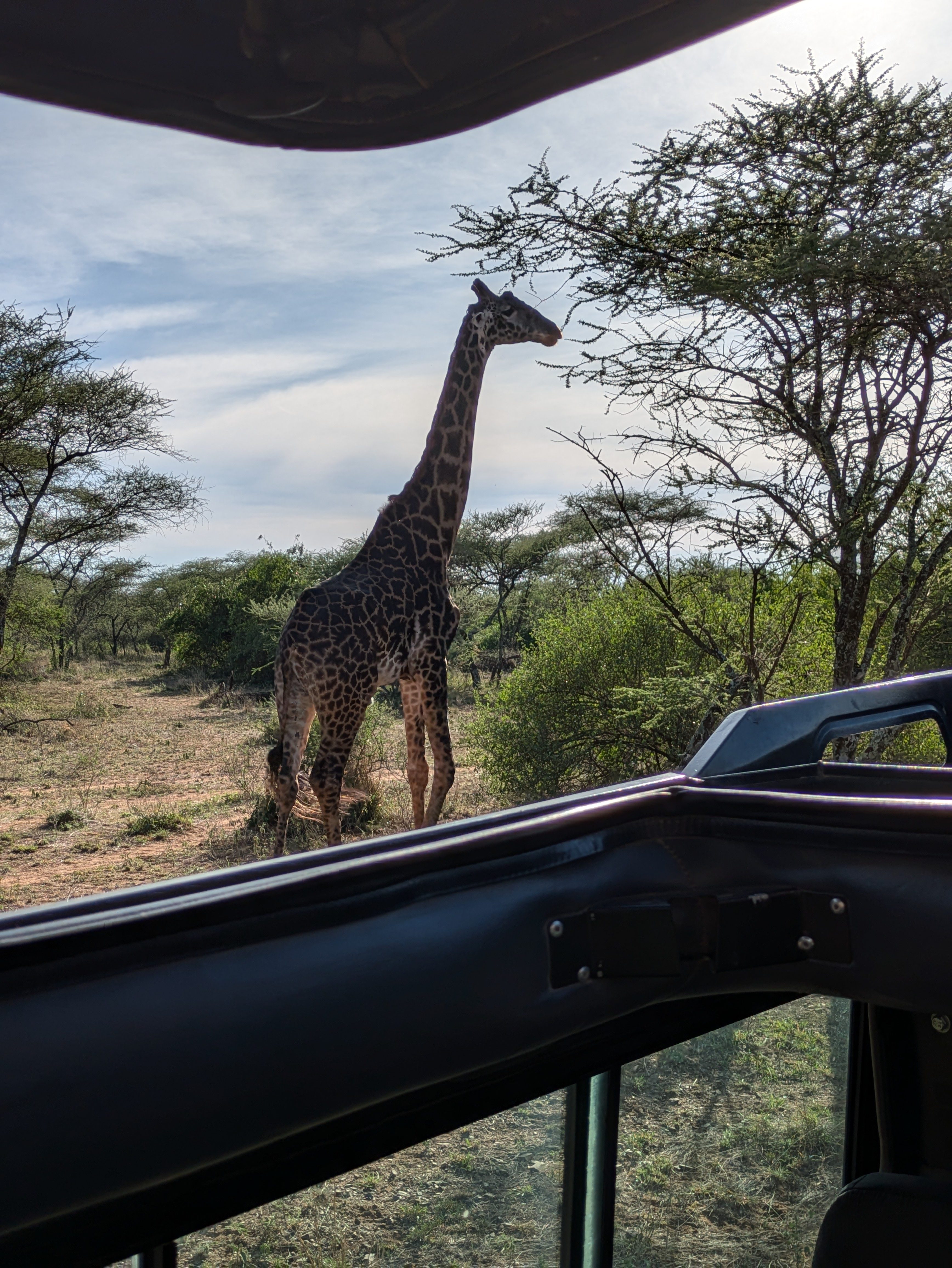 First flavour of the Serengeti was spectacular. We started with some sleeping lions near a tree, zebra and wildebeest a-plenty, giraffes in the distance and while we were focused on them, the driver suddenly stopped the vehicle because a giraffe stepped out from behind a tree. It was so close I could have almost licked it.