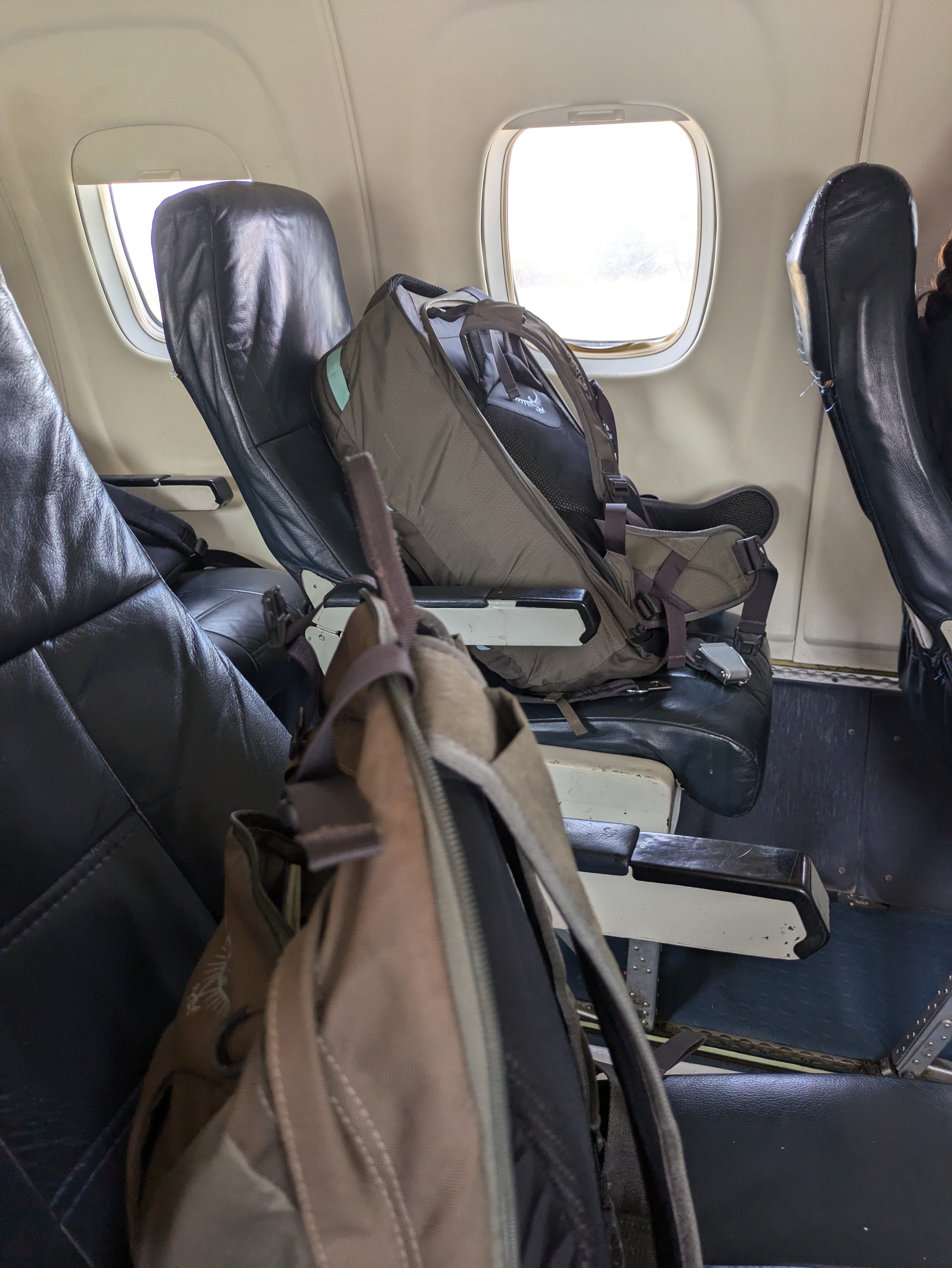 When I got to the top of the airstairs and peered inside the 30 seater plane, I realised there were no overhead bins. So I went back down and asked a worker.